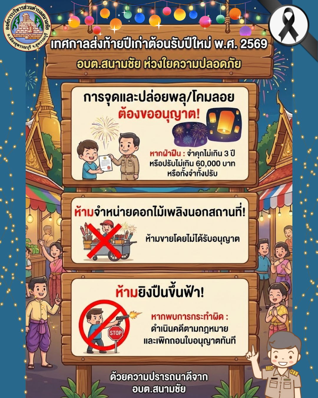 องค์การบริหารส่วนตำบลสนามชัย ขอเน้นย้ำมาตรการความปลอดภัยในการจุดและปล่อยพลุ ตะไล โคมลอย โคมไฟ โคมควัน รวมถึงการใช้อาวุธปืน เพื่อป้องกันอันตรายต่อชีวิตและทรัพย์สินของประชาชน